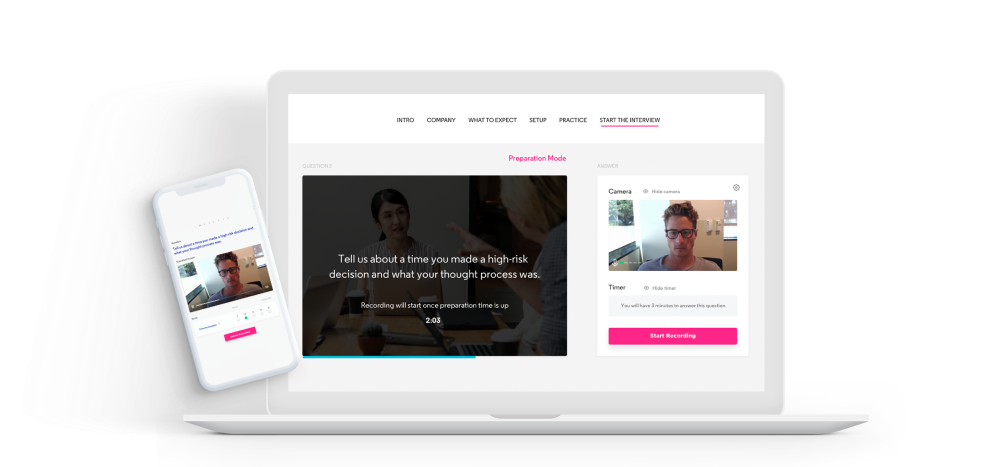 Candidates have the option to hide their self-camera and timer, practice using our system as much as they want and re-record each answer once if needed. Candidates can also learn about the company, role, and hiring process by watching videos that put each interview question into context.